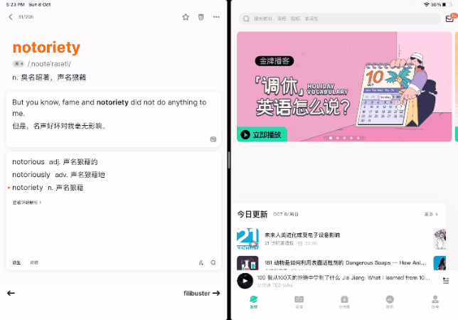 我这里使用的是 ipad 的分屏功能,左边是不背单词,右边是轻听英语。操作步骤是: