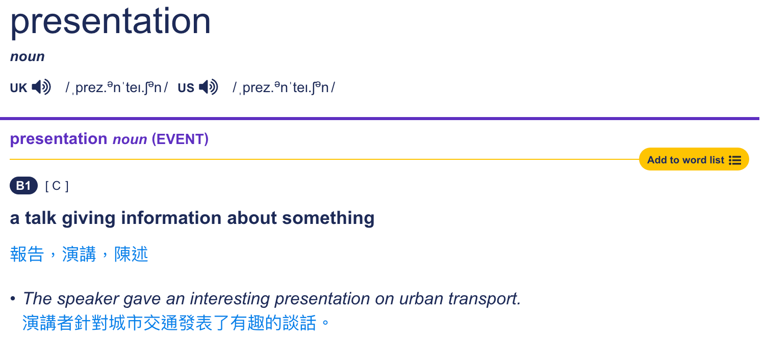 再举一个例子,presentation 和 report 这两个词,刚学的朋友会发现这两个词的中文都有报告的意思。但是到底有什么区别呢?我们先来看一下剑桥词典的解释
