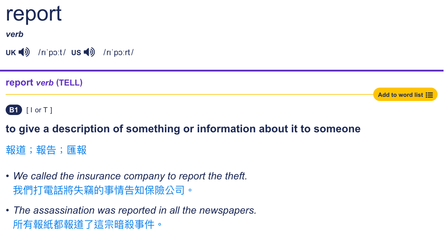 而 report 则会用在一些更为正式的语境下,比如新闻的报告,会说 news report。或者更多会用于表达书面报告的意思,比如一些机构出的一份详细的报告,则会用report,像我们常听到的 jobs report 就是就业报告。